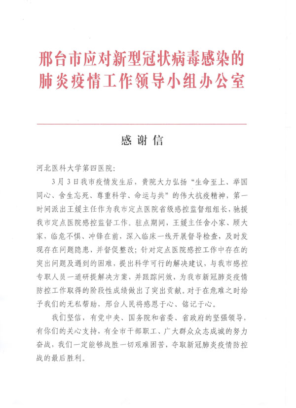 近期,邢臺市新冠疫情防控形勢嚴峻,根據上級要求,緊急抽調我院感染管理科王媛副主任,第一時間馳援邢臺市定點醫院進行感控監督工作。作為邢臺市定點醫院省級感控監督組組長,在28天的時間里,王媛與當地100余名醫務人員并肩奮戰,3月30日,邢臺市定點醫院在院患者清零,取得患者零重癥、醫務人員零感染的階段性勝利。邢臺市應對新冠肺炎疫情工作領導小組辦公室專門致信感謝王媛在此輪疫情防控工作中做出的努力,稱贊她“臨危不懼、沖鋒在前,給予了邢臺無私的幫助”。