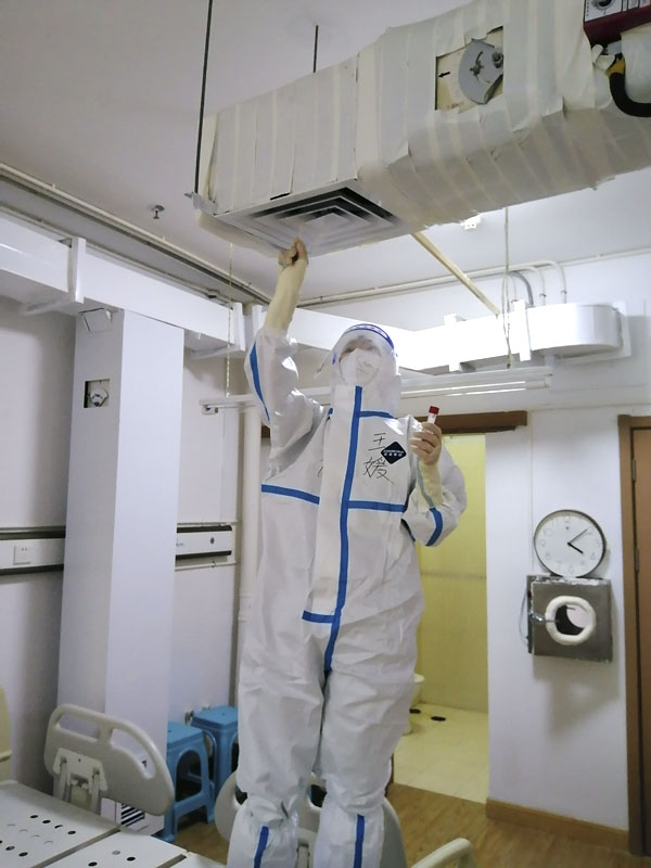 王媛副主任進駐定點醫院后,迅速成立包括主任、護士長、感控人員為主的院感核心管理小組,就現存情況制訂針對性措施,連夜部署落實。她與定點救治醫院主要負責人進行深入溝通,及時協調解決部分疏漏,始終強調感控優先原則,明確決策順序,堅持感控底線不能突破。同時,她提出應加強后勤保障能力,包括完善病區內維修人員配備、制定感控相關設備設施巡查維保機制、建立維修人員每日巡查制度等,確保第一時間解決相關問題。