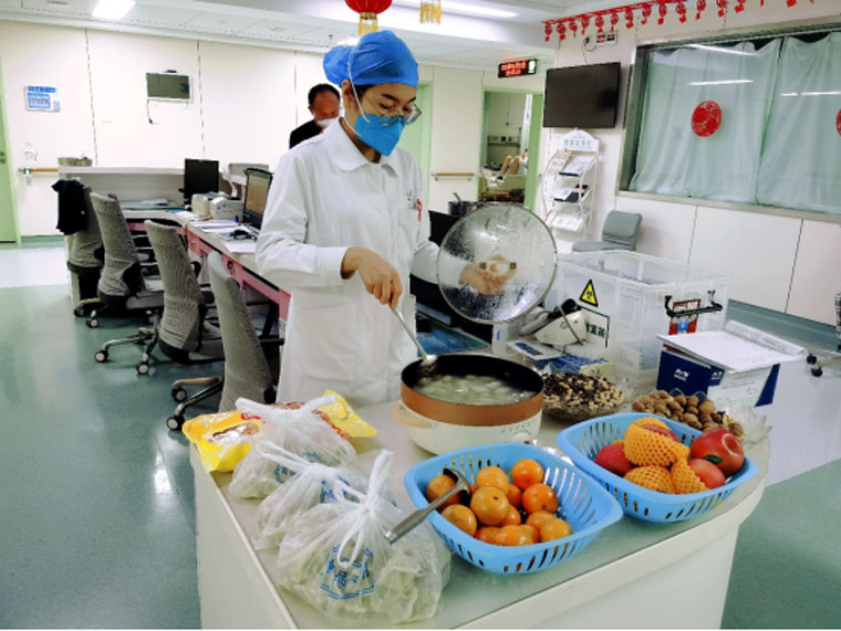 除夕夜,胸五科值班護士及醫生為在院患者送去熱騰騰的餃子、水果和最真摯的祝福,讓大家感到家一般的溫暖。
