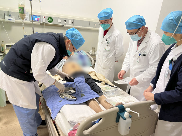 胸二科醫生認真、仔細查房,詢問患者情況,檢查患者手術傷口。