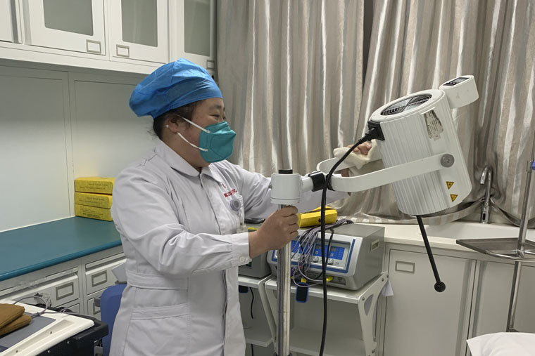 春節期間,皮膚科醫護人員為患者進行紅光治療。