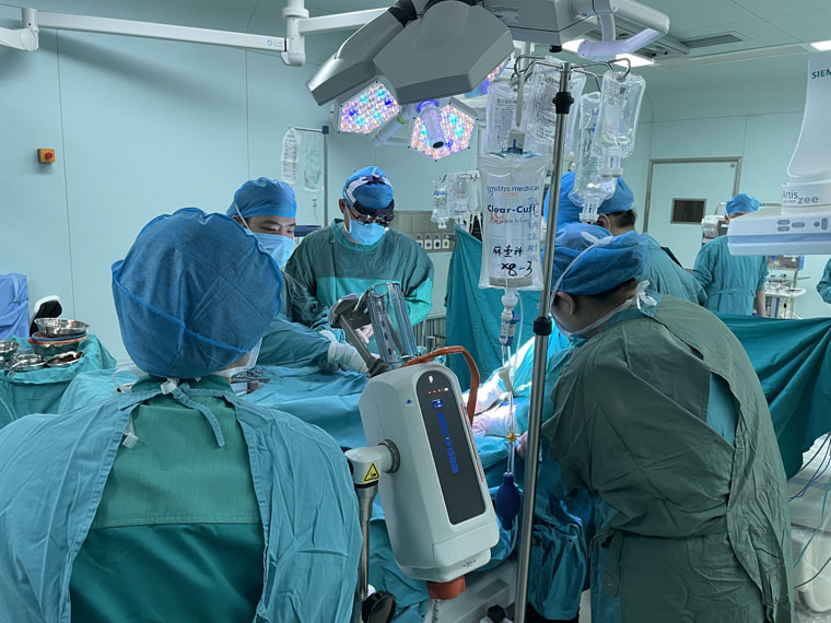 該患者為一名77歲女性,突發暈厥,在當地醫院檢查提示腹腔出血,為進一步診斷來我院就診,急診CTA提示腹腔血腫,經心臟血管外科診斷為“自發性髂靜脈破裂出血”而入院,病情危急。心臟血管外科趙永波副主任和放射科楊光主任溝通后決定在復合手術室開展手術,在放射科護士及技師、手術室護士、麻醉科醫師的通力協作下,順利完成修補重建血管-置入濾器-球囊擴張-放置支架等“開刀+介入”的操作,“修”出一條暢通的血管道路。