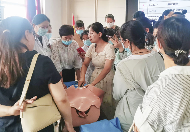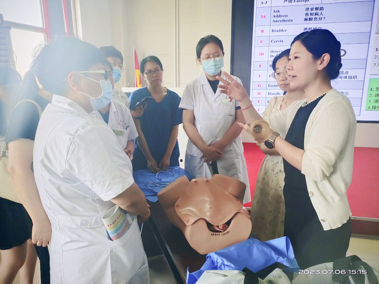 隨著國家生育政策的開放、人民生活水平的提升,高齡、肥胖女性呈增加趨勢,增加了孕產婦的妊娠風險。楊志芬副主任就目前產科發展現狀、發展理念和模式,以及引起孕產婦死亡主要原因之一的妊娠期靜脈血栓栓塞癥進行深入講解。她利用標準助記符(Check-list)、孕產婦急救的集束化管理(4Rs Bundle)等,幫助學員理解記憶,有利于提升醫護人員的綜合診療能力和團隊協作意識。東院產科劉廣譜、鄭芮醫師,辛集市第一醫院婦產科王弄主任分別就產時胎兒監護、妊娠期高血糖、產后出血進行理論授課。在陰道助產及肩難產實操培訓環節,我院專家通過“口訣式”記憶方法幫助培訓人員規范牢記助產流程、提升助產能力、確保母嬰安全。培訓現場求學“火爆”,反響強烈。