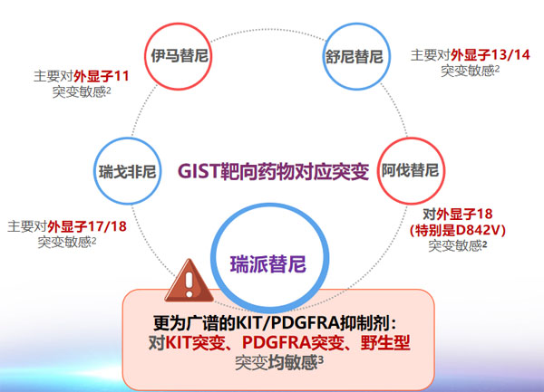 部分患者對伊馬替尼先天耐藥,導致疾病進展,胃腸間質瘤藥物治療除了伊馬替尼,還有很多的藥物可以選擇如:舒尼替尼、瑞戈非尼、瑞派替尼、阿伐替尼等。