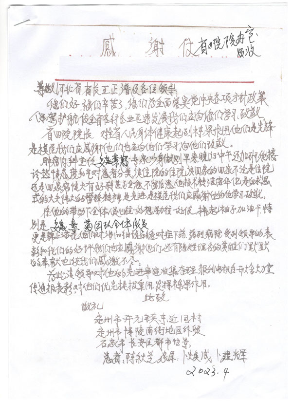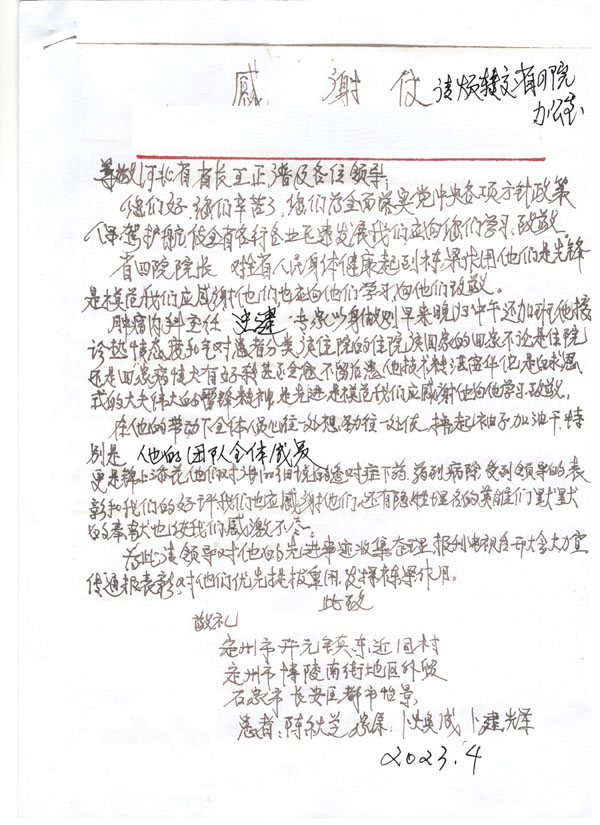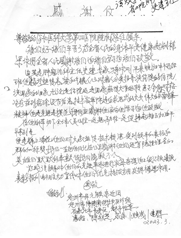 “注重人文關懷,構建和諧醫患”一直是我院不懈的追求,近日,我院收到一名"特殊"患者的感謝信,該信得到河北省政府、河北省教育廳及河北醫科大學領導的批示,字里行間對腫瘤內科史健教授、魏素菊教授、董倩副教授、孔雁副教授熱心周到的診療服務及科室全員積極向上的精神風貌表示連連稱贊。在醫院黨委的正確領導下,腫瘤內科深入貫徹“大健康”理念,全方位全周期守護患者群眾的生命健康,以實際行動推動醫院高質量發展。