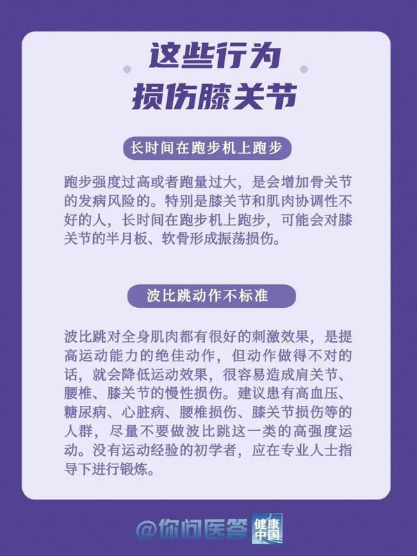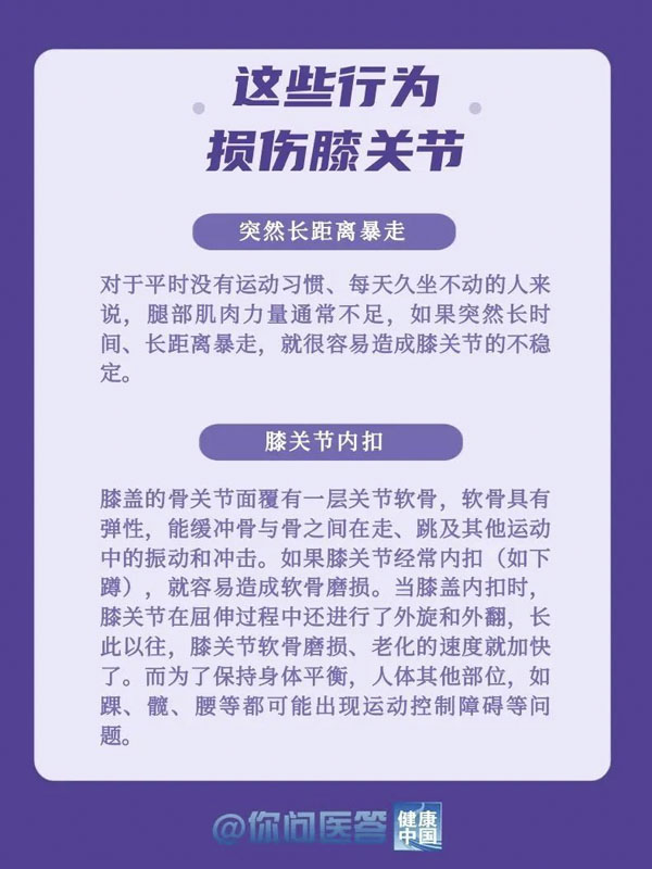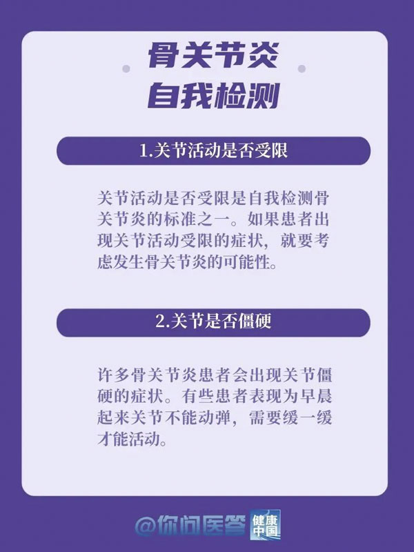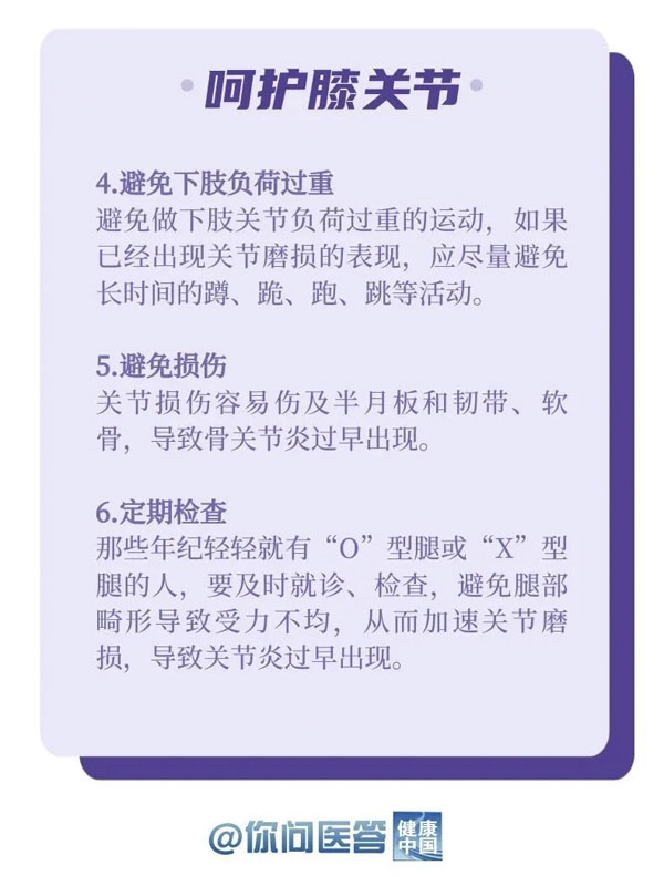 10月12日是世界關節炎日。關節炎是常見的慢性疾病之一。關節炎的種類繁多,其中以骨關節炎患病率最高。骨關節炎好發于負重關節及活動量較多的關節,如膝關節、髖關節等。你的膝關節還好嗎?生活中,有哪些常見的“傷膝”行為?保護關節,轉給你關心的人!