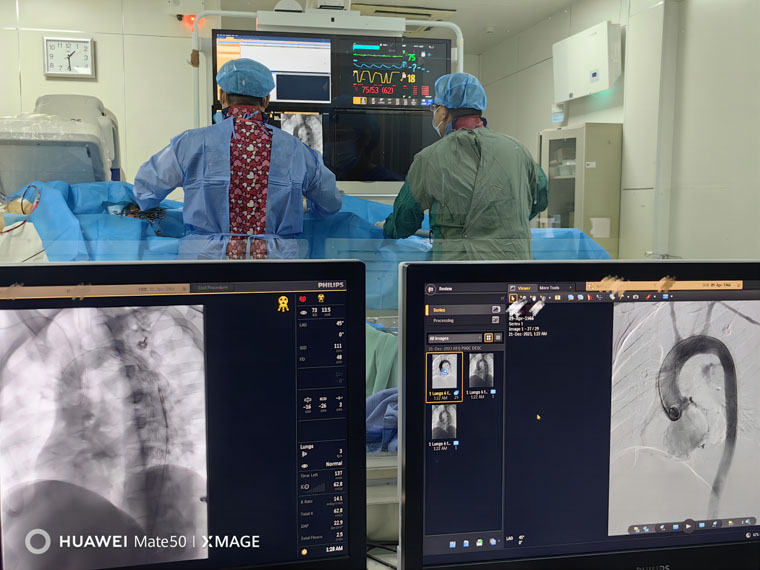 田子強教授查看病人并結合腫瘤情況,考慮患者不排除食管癌胸主動脈瘺可能性,遂聯系影像科急查胸主動脈CTA,結果顯示,降主動脈起始處前內側近食管腫瘤處尖角樣突起,考慮患者存在食管癌胸主動脈瘺。時間來到次日凌晨1點,心臟血管外科趙永波主任醫師及介入導管室值班醫師行“胸主動脈覆膜支架腔內隔絕術”,過程中可見降主動脈瘺口,造影劑明顯外溢,給予置入覆膜支架后,再次造影無明顯外溢,效果立竿見影,患者生命體征逐漸平穩。考慮到腫瘤破潰,局部存在感染導致再次出血風險,田子強教授向患者家屬緊急交代病情,后者要求接受手術治療,輸血科值班醫師積極協調血液資源。