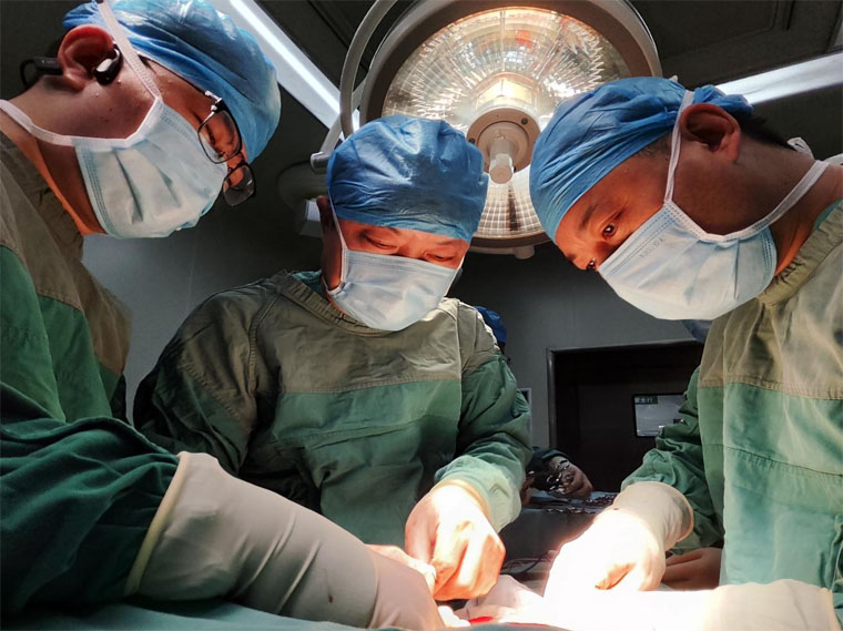 此刻,田子強教授團隊已連續完成6臺胸外科手術,但“病人的需要就是命令”,凌晨3時,他們與麻醉科、手術室通力協作,緊急行“開左胸食管癌切除、食管左頸部曠置術+開腹胃破損修補、胃部分切除術、腹腔積血清除+空腸造瘺術”。因探查到腫瘤與胸降主動脈及左主支氣管關系緊密,術者進行鈍性分離并翻轉主動脈弓充分分離腫瘤,予以切除胸段食管及腫瘤,后翻身消毒后行開腹探查腹腔大量積血塊,考慮到出血較快,胃壁張力較大導致胃壁破裂,充分清除腹腔積血后,發現賁門下小彎側長約5cm破裂口,予以修補并切除部分胃,并行空腸造瘺以便術后腸內營養支持治療,整臺手術持續約9小時,獲得成功。在醫護團隊的精心呵護下,患者術后恢復順利,已具備出院條件,擬于近日出院。