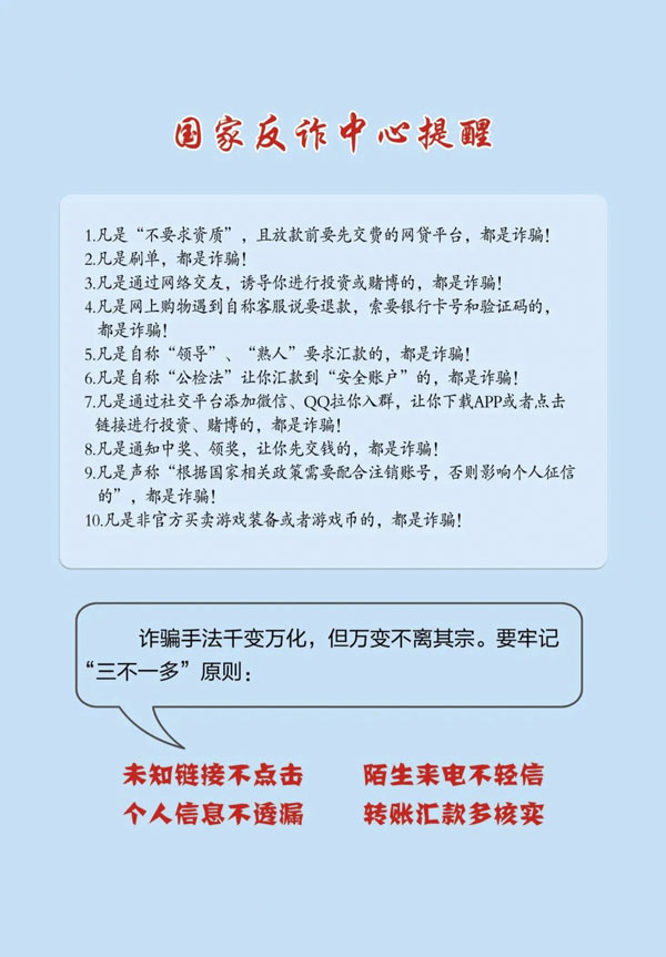 為進一步擴大反詐宣傳覆蓋面,提高廣大群眾防騙意識,國家反詐中心制作了《防范電信網絡詐騙宣傳手冊》,向廣大人民群眾介紹了十種常見的電信網絡詐騙類型,揭批了詐騙犯罪手法、文末有防騙神器,同時進行了防騙提示。