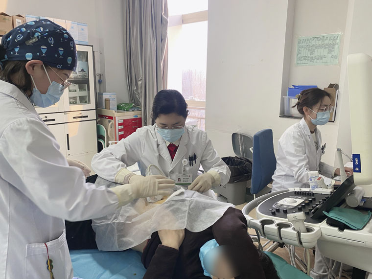 介入超聲團隊由10人組成,其中主任醫師2人、副主任醫師3人、高年資主治醫師5人,梯隊合理、技術力量雄厚,在疑難病例的消融、穿刺活檢、置管引流、硬化治療等方面積累了豐富經驗。2023年,科室完成超2.2萬例的介入超聲操作,在治療數量、手術難度方面有質的飛躍,臨床需求明顯增加。