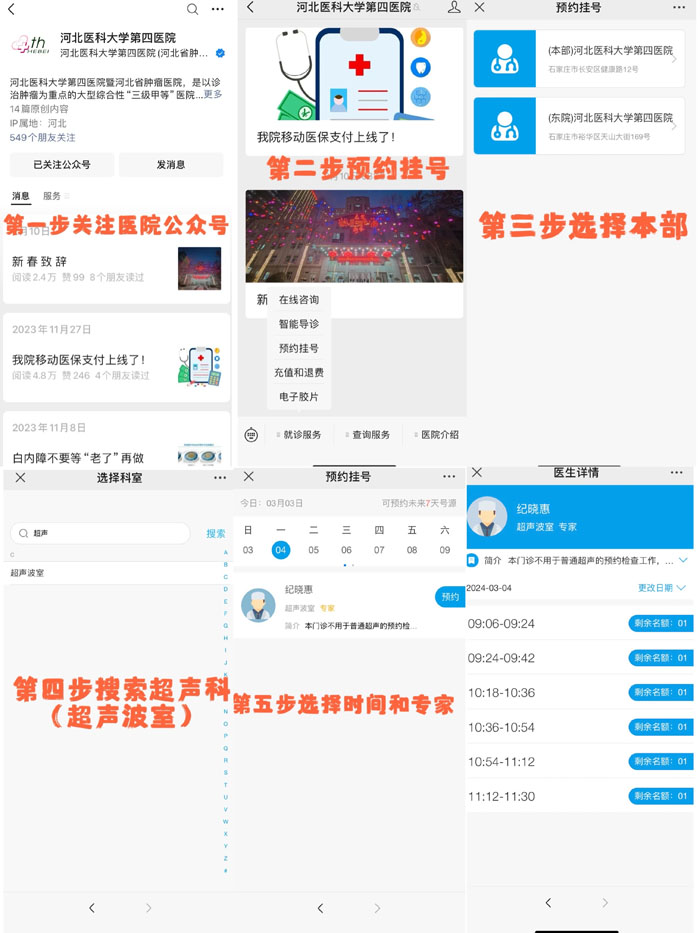 掛號流程:可通過醫院官方微信公眾號“河北醫科大學第四醫院”預約掛號,具體如下圖所示: