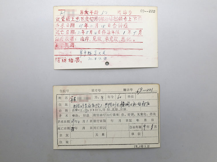 隨訪又稱隨診,即追訪性的診療服務,是對患者病情的追蹤及健康指導。從建院起,我院病案室便建立了食管癌和賁門癌出院患者常規隨訪體系,病案室承擔常規隨訪工作,現保存最早的隨訪卡片可追溯到1957年。我院至今累計完成食管癌手術4萬余例,達到國內先進水平,為世界單醫療中心之最,隨訪工作作為提高醫療質量、彰顯人文關懷的重要工作之一,也在持續進行中。