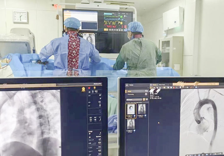 “病情十分緊急,如不及時治療,后果不堪設想……”此時,麻醉一科、介入手術室立即行動,迅速進行術前準備。術中,在心外科趙永波主任的指導下,李超主治醫師為患者實施胸主動脈覆膜支架腔內隔絕術。手術異常艱辛,心外科團隊全神貫注,將支架順利釋放,患者生命體征保持平穩,手術順利完成。家屬對心外科趙永波主任、李超主治醫師以及樊克非主管藥師表示敬意,“省四院的大夫醫術高超,很有熱心腸,太感謝你們了”。患者術后恢復順利,已平安出院。