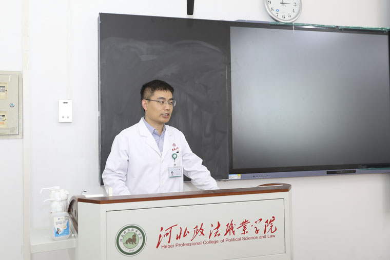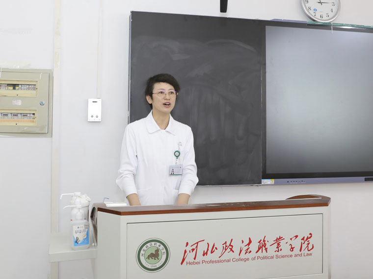 在第30個全國腫瘤防治宣傳周期間,4月18日,河北省抗癌協會攜手我院護理部組織食管癌整合護理專委會副主委、護理部副主任梁軍利,疼痛和麻醉專委會副主委、護理部副主任劉風俠,科普專委會副主委、外三科許夕霞主任護師,外科專委會主委、胸外科護士長趙俊敏,放療及罕見病專委會副主委、放療科護士長趙靜,胃腸外科專委會副主委、外二科副主任牛文博,傷口造口專委會委員、外二科護士長張雪娜,婦科專委會委員、婦科副護士長劉昭和急診專委會委員張寧主管護師等11位醫療護理專家,走進河北政法職業學院,舉行“CACA指南進校園”科普義診活動。