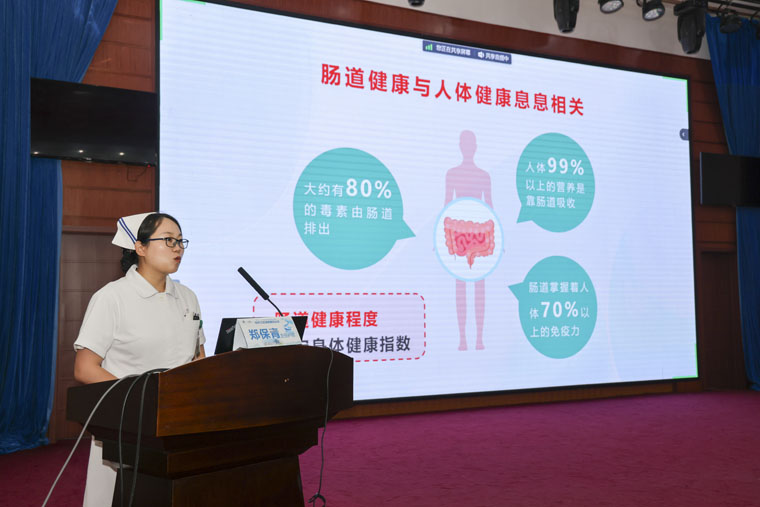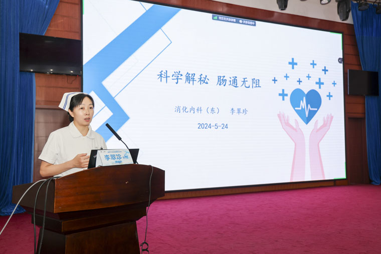 本次活動由東院消化內科病區主任殷飛教授主持,東院醫務處處長邢鵬輝致辭。在科普講座環節,東院消化內科病區護士長李翠珍講解了如何預防和解決便秘,提醒大家“腸”健康,才能常健康。鄭保青主管護師介紹了腸道疾病篩查的注意事項。心理咨詢專家吳艷敏老師講解了負性情緒與心理健康的關系。