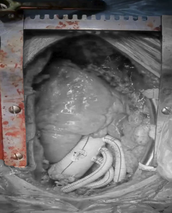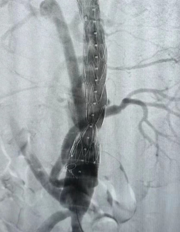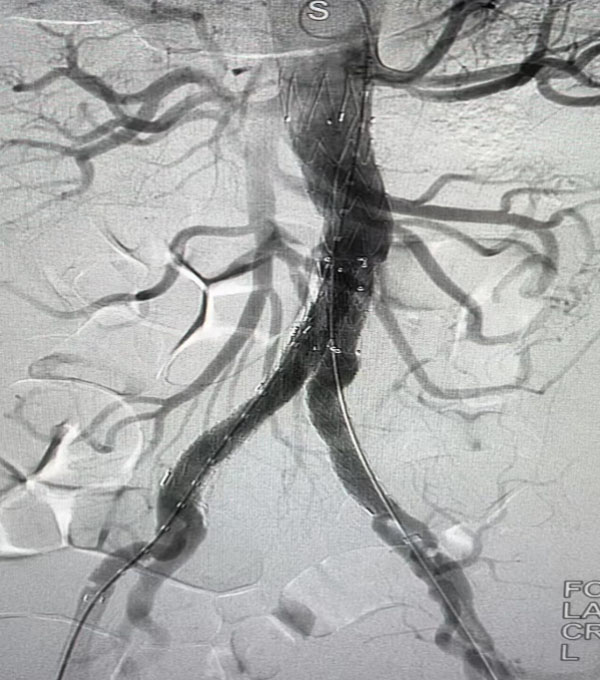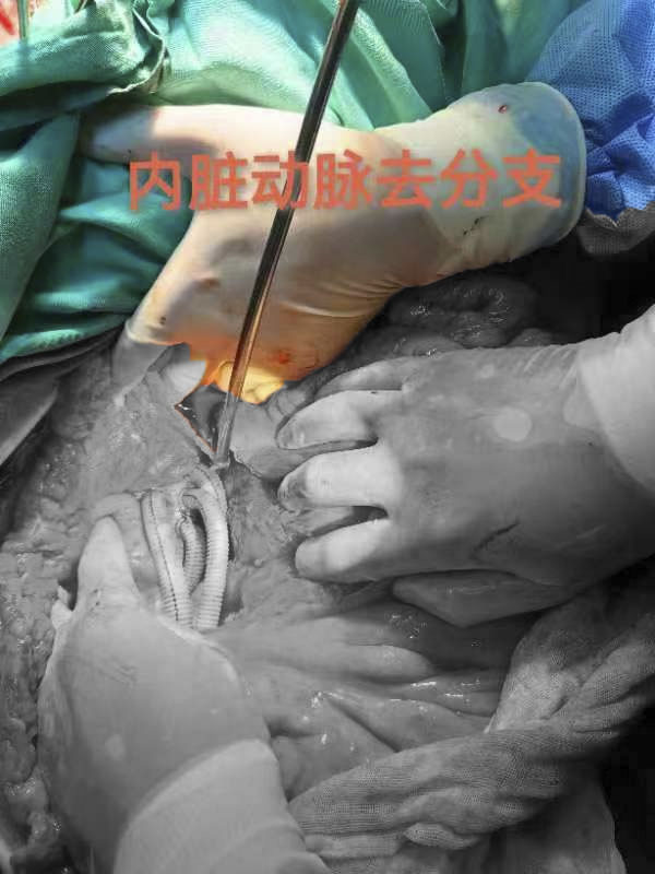 當日上午,待患者麻醉成功后,手術演示直播正式開始。在DSA復合手術室,侯五輝主治醫師進行病例匯報:患者A型夾層術后8年,遠端胸腹夾層動脈瘤形成,擬行“腹主動脈置換+內臟去分支+胸腹主動脈腔內隔絕術”。手術由我院心外科負責人趙永波主刀,龔琪副主任醫師、要凱主治醫師、李超主治醫師共同參與,術中夾層動脈瘤與周圍組織粘連嚴重,可能出現大出血危及生命。手術團隊運用高超嫻熟的技巧,密切配合、攻克難關,順利完成開放手術腹主動脈置換及腹腔臟器血管重建,隨后進行腔內修復手術。該手術充分展現了我院心臟血管外科團隊“兩棲作戰”的復合手術能力,得到國內專家的一致好評。