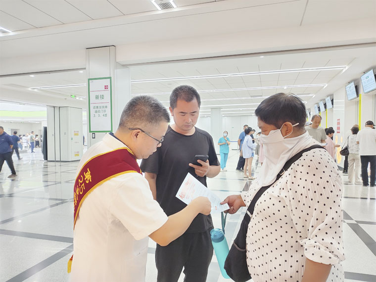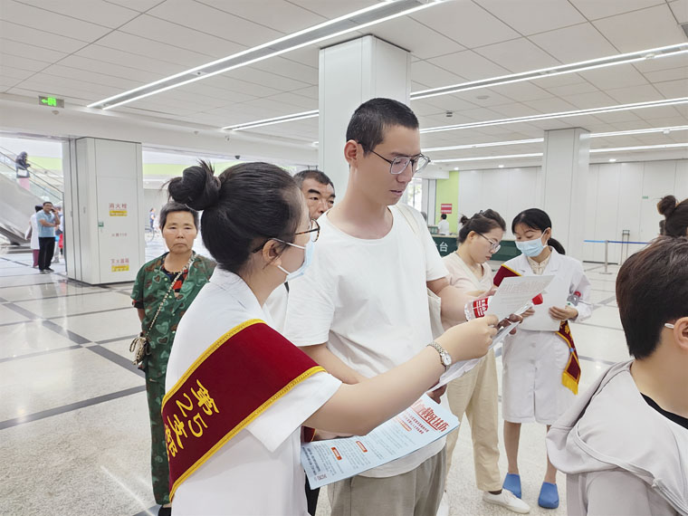 活動現場,劉敬閃主任帶隊與我院輸血科醫務人員,結合院內大屏幕宣傳視頻、條幅、宣傳單、海報等媒介,講解無償獻血政策、知識及血費報銷政策,傳播無償獻血的理念和重要意義,呼吁更多群眾加入無償獻血者隊伍,弘揚獻血者無私奉獻的人道主義精神,傳遞社會正能量。宣傳活動正處于門診高峰期,志愿者們主動疏導患者有序就診,并免費提供水、扇子等防暑物品,現場發放宣傳材料300余份,提供相關咨詢服務百余人次,受到廣大患者和家屬的一致好評。