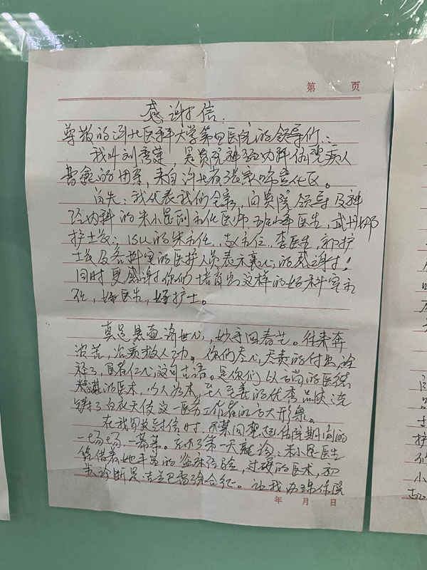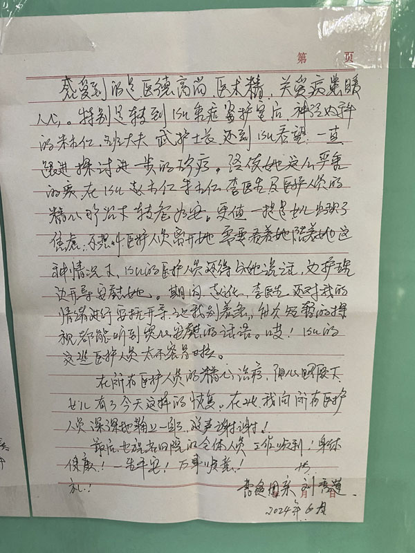 經歷了“絕處逢生”,患者和家屬對我院的診治水平和服務水平表示充分肯定,在感謝信中,她真情回憶著在院的點點滴滴,字字流露出對我院神經內科、重癥醫學科、CT磁共振科、疼痛康復科醫護人員的感恩與祝福。