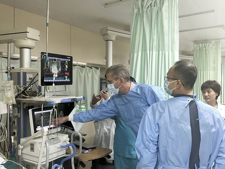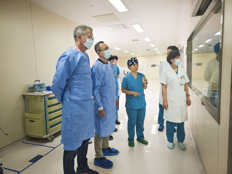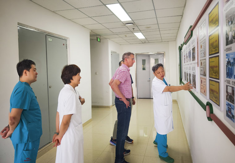 交流現場,胡振杰主任介紹了科室發展情況,并與蔡斯教授深入交流了中新兩國重癥醫學的發展歷程。隨后,蔡斯教授一行參觀了我院重癥醫學科發展歷程展,在病區詳細了解各種設備的功能、用途等,對科室高效有序的運作模式表示由衷贊賞。
