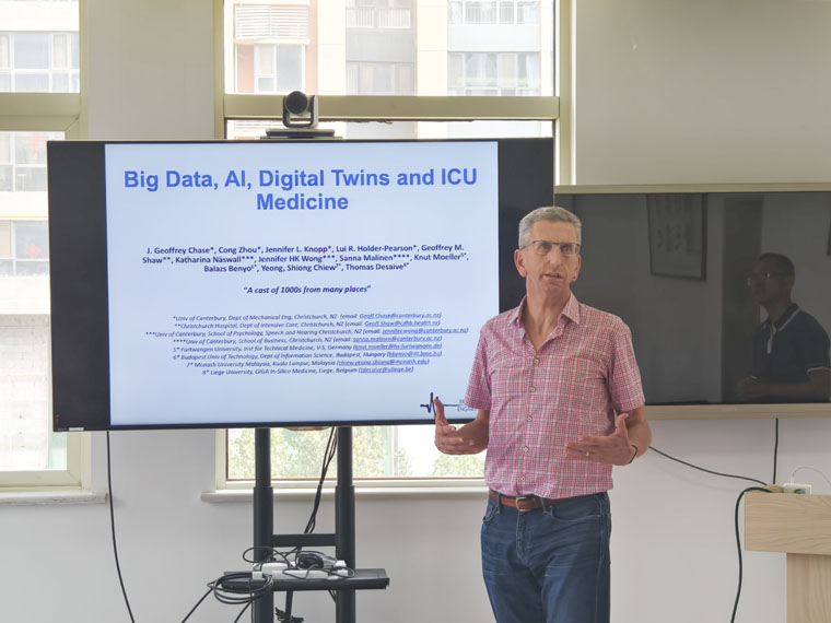 蔡斯教授以《Big Data,AI,Digital Twins》(《大數據、人工智能、數字孿生》)為題,為重癥醫學科的醫護人員、在讀碩博研究生帶來學術分享,周聰教授擔任同聲翻譯。蔡斯教授闡述了當前重癥醫學領域面臨的挑戰以及大數據和人工智能在其中的應用前景,條理清晰、案例生動,在場每一位聽眾都深受啟發。大家踴躍發言,提出了在重癥醫學、大數據和人工智能相關領域遇到的問題和疑惑,蔡斯教授以獨到的見解和豐富的經驗,提供了建議和指導。