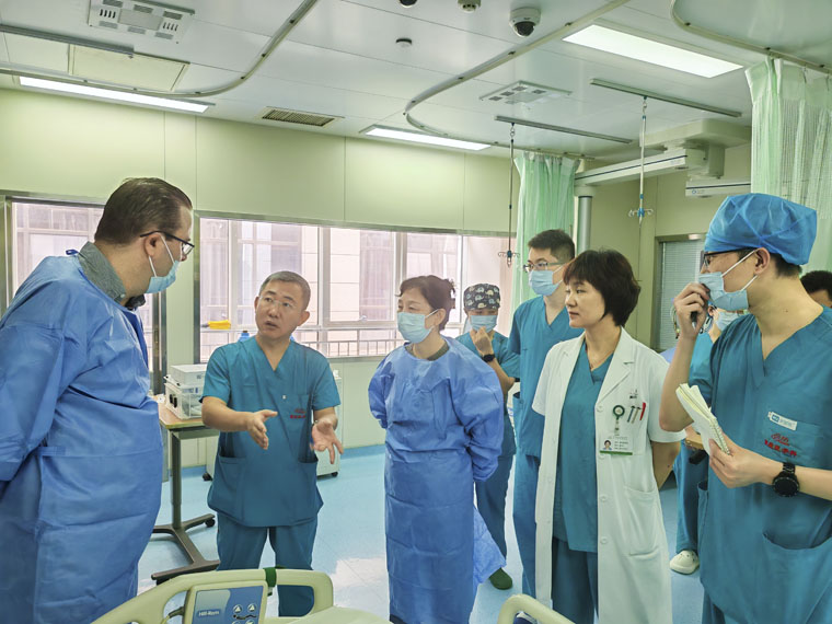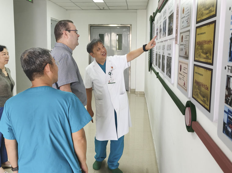 胡振杰主任向托馬斯·里梅萊教授介紹了科室發展情況,雙方深入交流了中法兩國醫學的發展歷程。托馬斯·里梅萊教授參觀了我院重癥醫學科發展歷程展覽,詳細了解病區各設備的功能、用途,對我院便捷的病例信息系統表示興趣濃厚,對重癥醫師熟練掌握各項技能表示稱贊。