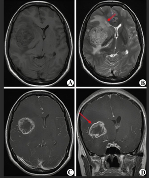 (圖A-D顯示為高級別膠質瘤的核磁表現,紅箭頭指示腫瘤所在)