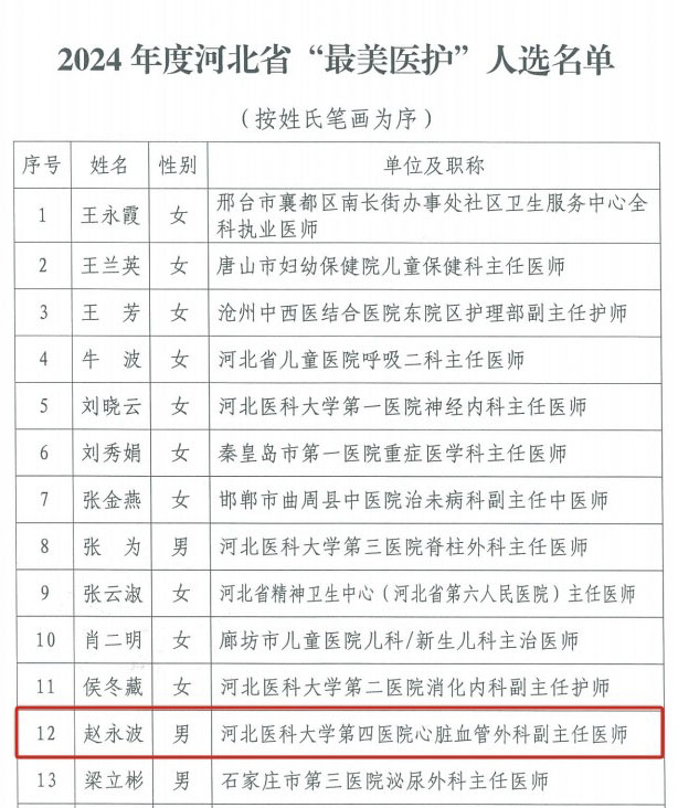 此前,經各市、省直衛生健康單位推薦及省級綜合評定,省委宣傳部、省衛生健康委、省總工會決定,授予我院心外科趙永波副主任醫師等15名同志2024年度河北省“最美醫護”稱號。
