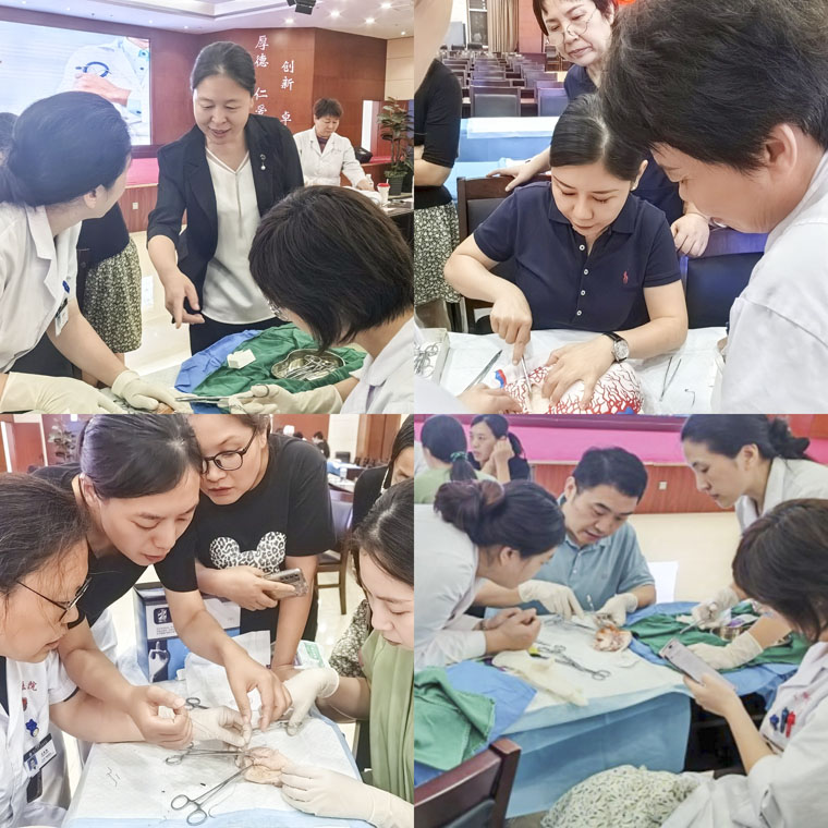 在實操演練環節中,楊志芬副主任和王勝普醫師通過使用子宮模型和尿管代球囊等模擬工具,對產科手術止血技術要點進行全面講解,在子宮模型上展示了B-Lynch縫合、Hayman垂直壓縮縫合、CHO縫合、子宮動脈結扎等手術標準化操作示范。路月梅主任醫師和秦玉珍醫師通過親手制作會陰裂傷動物模型,演示了縫合技巧并強調縫合過程中的關鍵注意事項和處理原則。隨后,參訓人員分組進行了實際操作練習,確保每位醫護人員都能掌握這些關鍵技術。學員們紛紛表示,“省四院專家帶來了規范化、系統化的理論知識與技術操作,非常實用,有利于幫助我們將所學知識應用于實際工作中。”
