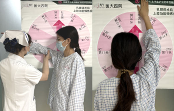 我院乳腺中心積極響應國家號召,持續推進“改善就醫感受、提升患者體驗”專項工作。科室針對乳腺疾病慢病管理現狀,以乳腺癌患肢功能康復為支點,循證護理理論為指導,聚焦乳腺癌患肢(因手術等因素影響肢體活動,稱為“患肢”)功能鍛煉的細節管理與實施,開展多專業護理聯動。目前形成了“三固定、兩靈活”的管理模式,建立了院前、院內、院外一體化診療、護理、隨訪流程,致力于讓患者就醫的每一個環節更有溫度。