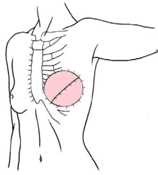科室醫務人員在討論中表示,如果切除左側乳房及全部受累皮膚,胸壁將留下巨大缺損;如果不切除受累皮膚,將面臨極高的局部復發風險的情況,且此類患者術后需要放化療,采取快速可靠方法修復創面缺損具有重要意義。考慮傳統的背闊肌皮瓣因背部皮膚彈性較差,患者可能還需要再次進行植皮修復,回天立副主任醫師提議為王女士進行左乳癌改良根治術+Kiss背闊肌皮瓣移植術,這樣既能達到腫瘤的原發灶姑息性切除目的,又能避免低質量的植皮,為患者后續的放療創造良好的條件。
