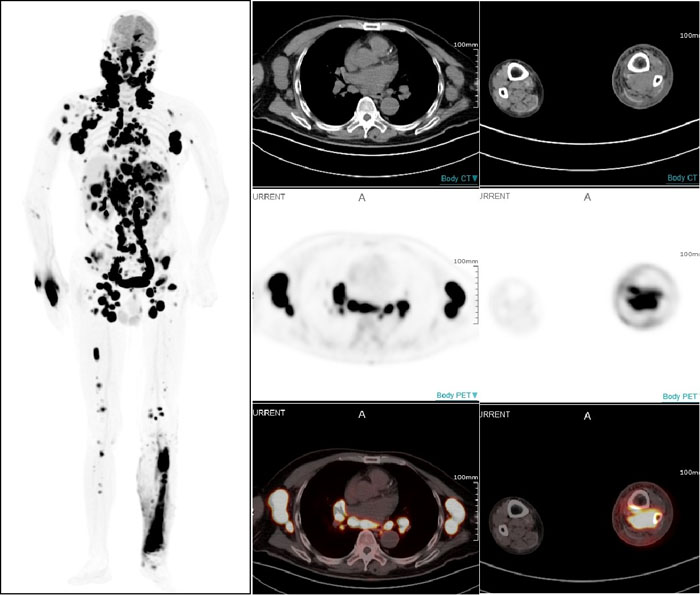 一名67歲男性患者因近期無明顯誘因出現左頸部淋巴結腫大而就醫,淋巴結切檢病理診斷為非霍奇金彌漫大B細胞淋巴瘤。借助全景動態Total-body PET/CT掃描,不僅確認了此前的診斷,還發現腫瘤已廣泛累及全身多處淋巴結及乳腺、胸膜、肝臟、脾臟、胃等多個結外器官。更令人稱奇的是,連平時難以察覺的右小腿深部肌肉組織病變也被準確捕捉。這一全面而精確的影像信息,有效提升了治療的針對性,為醫生制定個性化治療方案奠定了堅實基礎。