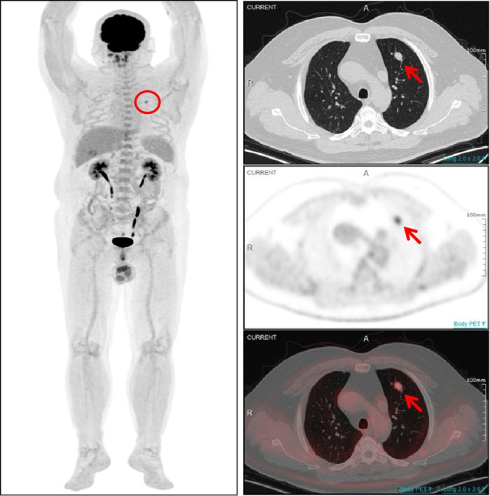 ?一名54歲男性患者曾在1年半前接受了左大腿脂肪肉瘤切除術,術后規律復查。一次常規CT檢查發現其左肺上葉存在一個軟組織結節,隨后復查顯示該結節有所增大,直徑約為1.0cm。面對這一疑似轉移的挑戰,全景動態Total-body PET/CT 清晰顯示左肺上葉結節伴明顯異常葡萄糖高代謝,提示該結節為肺轉移灶。基于檢查結果,醫生能夠及時為患者制定更加個體化的治療方案。對該患者的診斷,彰顯了全景動態Total-body PET/CT 在癌癥診斷領域的非凡實力。