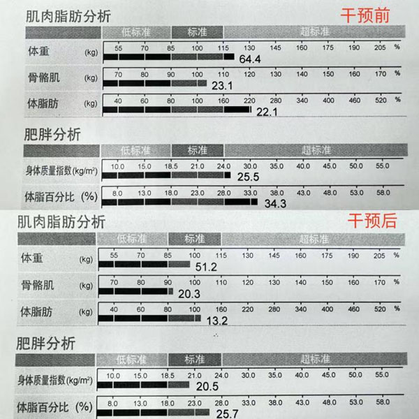 營養科主任高淑清針對患者的膳食習慣和日常運動方式展開了全面評估和身體成分測定。結果顯示,體重指數(Body Mass Index,BMI)明顯偏高,體脂百分比遠超正常標準,腹部脂肪大量堆積,內臟脂肪面積更是嚴重超標,但平日里的飲食量處于正常范圍,活動量也較為適中。綜合這些情況,并結合各項實驗室指標,營養科團隊為患者選擇了“5+2輕斷食”的減重方式,并定制了具體的實施方案。該方式是指以1個星期為周期,根據自己生活、工作的需求,一周中不連續的兩天,每天攝入500kcal(女性)或600kcal(男性)熱量的食物,其余5天可相對自由進食的減肥方法。