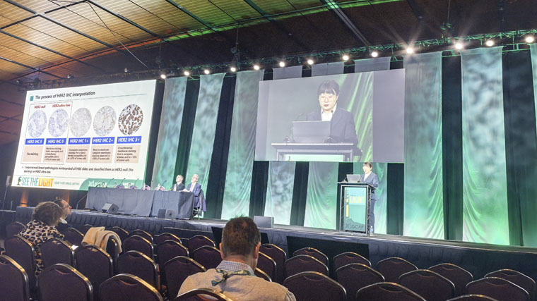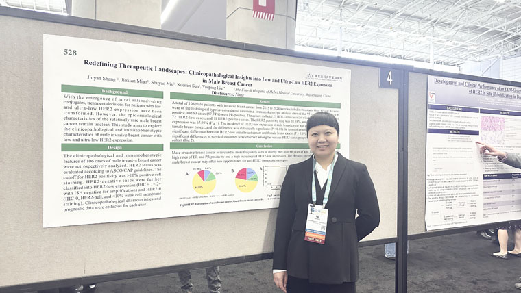 在發言環節,病理科丁妍副主任和李金澤醫生代表科室參會,她們以嚴謹的研究方法、詳實的數據和清晰的思路向全球同行展示了乳腺病理最新研究成果,現場專家表達了濃厚興趣,引發了熱烈討論和交流。在壁報展示區中,病理科的5篇壁報涵蓋了腫瘤病理、分子病理、人工智能輔助病理診斷等多個領域,吸引了眾多參會者的駐足討論,展示了科室在病理學研究方面的多元化和創新性,獲得了現場專家的高度認可。