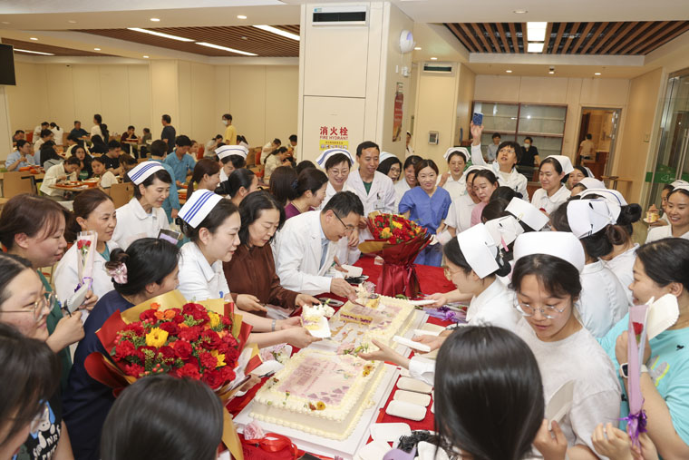 護士節當日中午,院領導李曉玲、何宏濤、魏迎、彭利分別在兩院區職工食堂親手為護理人員派發節日蛋糕,用最樸實的方式向“白衣天使”送上祝福。“大家平時總在病房里給患者送關懷,你們守護患者,我們守護你們”,院領導表示。