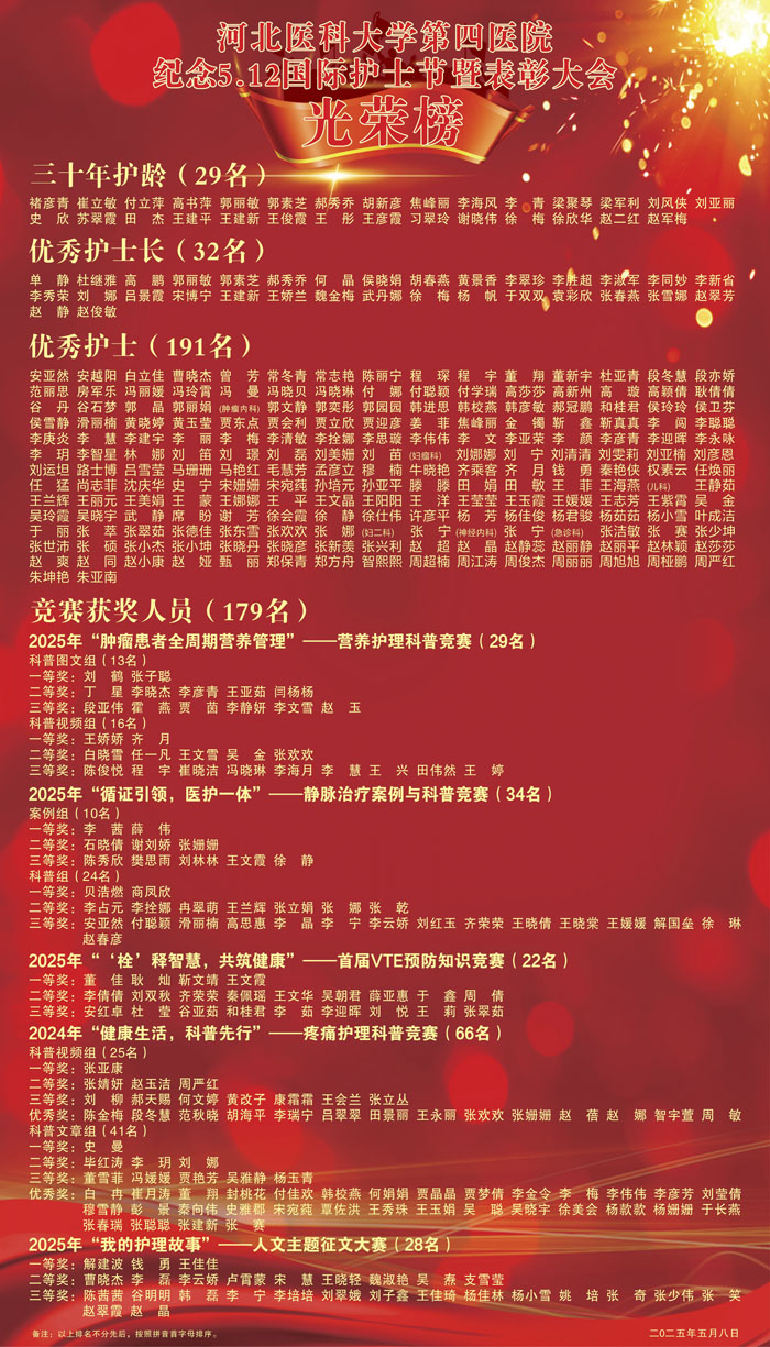 會上,黨委副書記、紀委書記李曉玲宣讀三十年護齡護理人員名單,副院長趙群宣讀2024年優秀護士長、優秀護士名單,總會計師魏迎宣讀營養、靜療護理專業小組競賽獲獎名單,副院長田曉玲宣讀VTE、疼痛護理專業小組競賽獲獎名單,副院長馬景濤宣讀“我的護理故事”人文主題征文大賽獲獎名單。院領導們依次為獲獎個人頒獎。