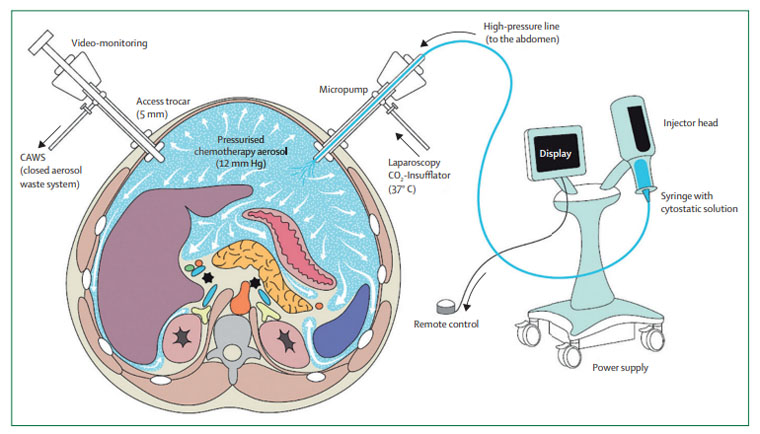 PIPAC是近年來新興的腹膜轉移癌治療技術,其核心原理是通過腹腔鏡建立腹腔通路,將化療藥物制成氣溶膠狀態,在壓力作用下實現腹腔內均勻分布。與傳統腹腔化療相比,該技術具有三大優勢:一是藥物可深入腹腔微小癌灶,解決傳統給藥難以覆蓋的治療盲區;二是低劑量藥物即可實現高效滲透,顯著降低全身毒副作用及并發癥風險;三是壓力梯度驅動力可提升腫瘤組織藥物攝取率,進一步增強抗腫瘤效果。