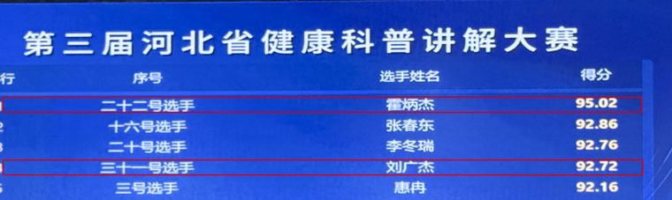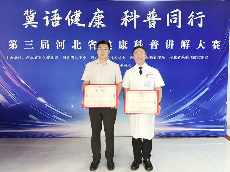 7月16-17日,由省衛生健康委、省總工會、省科協、省中醫藥管理局、省疾病預防控制局聯合主辦的第三屆河北省健康科普講解大賽決賽在石家莊圓滿落幕。來自全省各地的67名醫學精英展開激烈角逐,最終,我院中西醫結合腫瘤科霍炳杰主任醫師以95.02分全場總分第一的成績摘得桂冠,榮獲一等獎;胸二科劉廣杰主任醫師獲得二等獎。