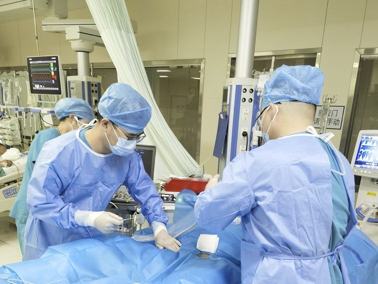 面對急危情況,重癥醫學科團隊迅速啟動應急響應機制。體外膜肺氧合技術(ECMO)小組在胡振杰教授的指導下,順利為患者實施(VA-ECMO)靜脈-動脈體外膜肺氧合置管術。該技術是一種生命支持技術,通過將患者體內的靜脈血引出體外,經過體外氧合器氧合、去除二氧化碳等處理后,再泵回病人體內,起到呼吸及循環支持的作用,為后續治療贏得關鍵時間窗口。眾所周知,術后高危肺栓塞治療困難極大,該例患者為大手術后第一天,溶栓治療是禁忌癥,同時也沒有取栓的適應癥,因此,在積極抗凝治療基礎上通過ECMO穩定患者的呼吸及循環功能,保證重要器官的氧供,為患者打開了通向“新生”的通道。經過4天的生死博弈,患者的呼吸、循環逐漸穩定下來,肺動脈壓明顯下降,順利撤離ECMO。