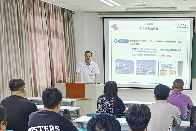 入培第一課由副院長田曉玲主持,常務副院長何宏濤對新學員表示歡迎,并詳細介紹醫院的發展概況以及研究生、住培教學工作開展情況,他勉勵學員“遇良師、結益友,以仁心仁術踐行醫者使命”。