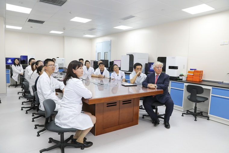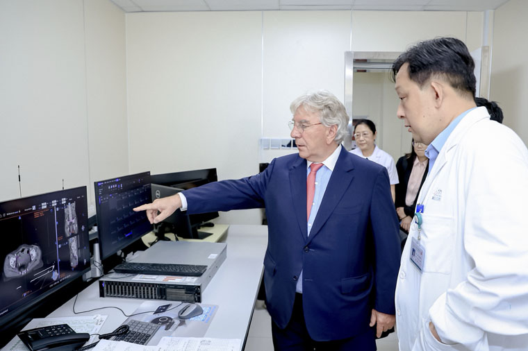 會前,Untch教授先后走訪了東院區放療科、病理科及乳腺中心臨床研究病房。在放療機房,他與醫護團隊圍繞乳腺癌、宮頸癌患者放射治療方案展開實時病例研討;在河北省數智病理中心,對該中心基于超千萬張病理圖像構建的高質量數據集及高效處理多類臨床診斷任務的AI模型給予高度評價,并肯定了遠程病理會診平臺的建設成果。隨后,Untch教授深入臨床研究病房,對三位年輕晚期乳腺癌患者進行教學查房,以嚴謹的學術態度和人文關懷與患者溝通病情,提出國際化治療建議,其專業素養獲醫患一致贊譽。