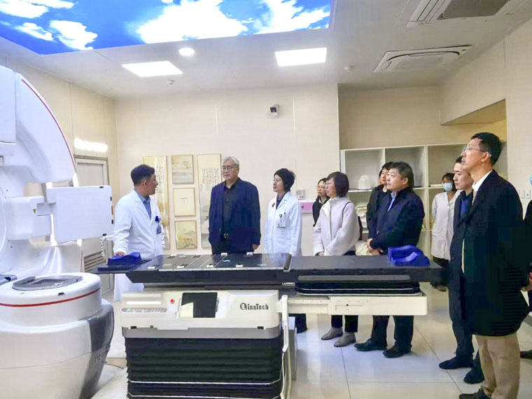 專家團由山東省腫瘤醫院副院長邢力剛帶隊,成員包括放療病區大科主任兼腹部放療一病區主任岳金波、放射物理技術科主任尹勇、放射物理技術科副主任朱健、資產管理與經濟運營部主任盧潔、醫學裝備部工程師趙彥富等6位腫瘤放療領域的專家學者。我院放療科主任王軍,胸部放療二病區主任王瀾,胸部放療五病區主任周志國,放療技術組主任遲子鋒、副主任張若輝、技師長苗明昌、物理室組長尚凱等全程陪同參觀交流。