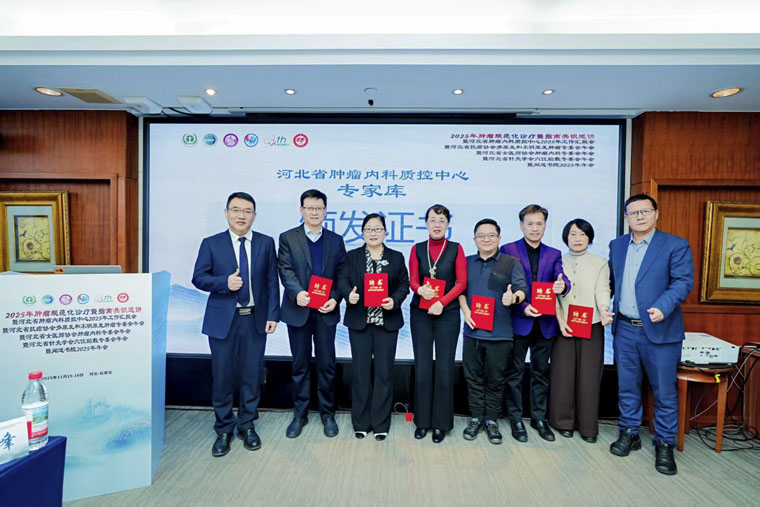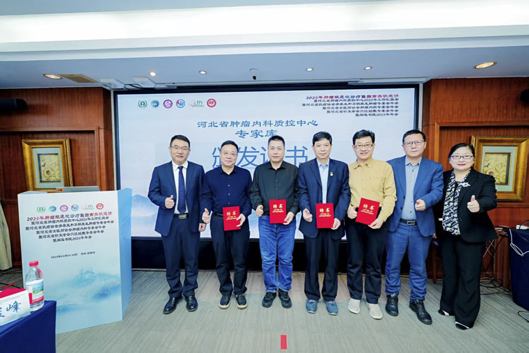 隨后,常務副院長何宏濤和北京大學第一醫院吳世凱教授共同向胸外科、普外科、肝膽胰外科、介入科、放療科和腫瘤內科等領域的河北省腫瘤內科質控中心專家庫成員頒發證書。