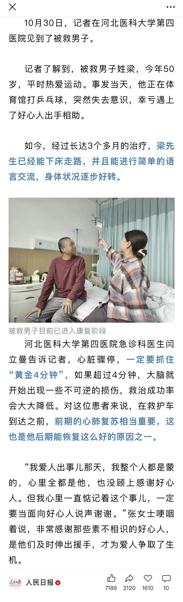 看著患者重獲新生,東院急診科醫務人員表示,所有的日夜堅守、艱辛付出,都化作了滿心的欣慰與感動。此次生命救援,也被人民日報官方微信號關注報道,生動詮釋了我院“以患者為中心”的醫者擔當與精湛的救治水平。