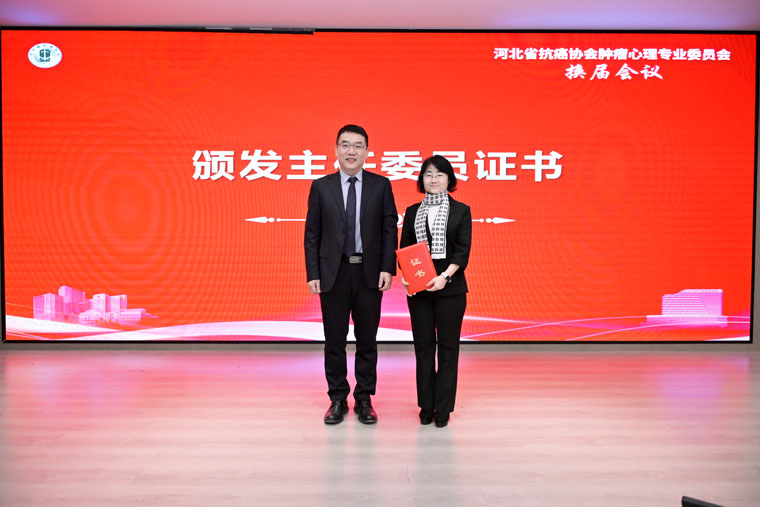 換屆環節由河北省抗癌協會副秘書長李來有教授主持。協會組織部部長何明教授宣讀換屆批復文件,我院腫瘤內科洪雷副教授代表第二屆主任委員張靜教授做了工作總結匯報。經選舉,我院腫瘤內科崔彥芝教授擔任第三屆腫瘤心理專委會主任委員,洪雷副教授當選副主任委員。