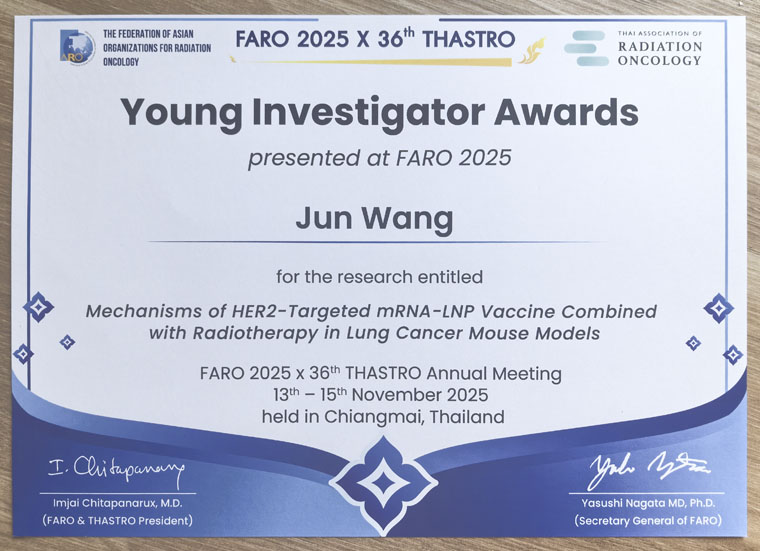 我院王軍教授榮獲亞洲放療聯盟(FARO)“青年研究者獎”