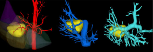 肝膽外科收治的這名患者主因皮膚黃染伴腹部疼痛數月余,綜合臨床癥狀及檢查檢驗結果,臨床醫生評估患者情況十分危急,若不及時進行手術會危及生命。CT磁共振科對患者實際情況精準進行了醫學影像三維重建,彩色3D圖像清晰顯示了肝內各個分段及肝動靜脈,以及肝內腫瘤的位置、大小及與周圍肝內血管、肝內膽管的關系。