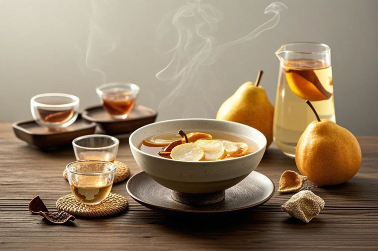 薺藕甘露飲:荸薺20枚,百合50克,梨子1個,銀耳兩朵。將荸薺洗凈去皮,百合、梨一起搗爛取汁與銀耳一起燉煮。
