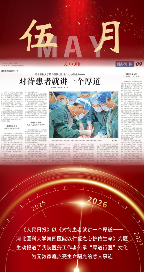 回望2025,在守護人民群眾健康的新征程上,河北醫科大學第四醫院始終堅持以習近平新時代中國特色社會主義思想為指引,緊扣“健康中國”戰略部署與“健康河北”建設要求,錨定高質量發展主線,在醫療質量提質、硬件設施升級、技術攻關突破、科研創新賦能、服務溫度提升的賽道上篤行不怠、闊步向前。無數堅守與拼搏交織,許多突破與感動定格,總有一些瞬間,在記憶里熠熠生輝;總有一些故事,在歲月中溫暖綿長。