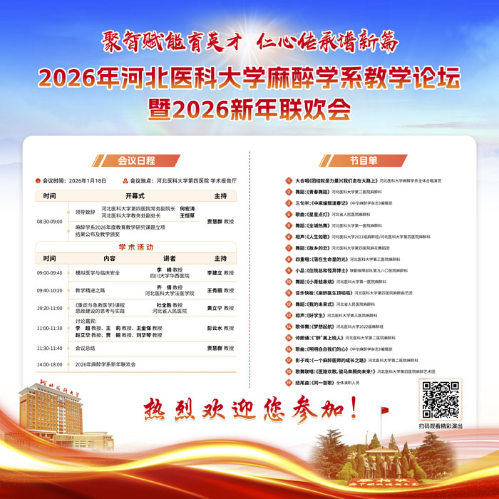 本次會議是學校麻醉學系在教育教學改革與人文精神建設深度融合的又一次深入探索,彰顯了麻醉教學團隊團結一心,追求卓越的精神面貌。這樣一支有著凝聚力的優秀隊伍,必將在未來征途上躍馬揚鞭,努力奮進,堅定信心,乘勢而上,為高質量人才培養書寫更加精彩的篇章!值此“十五五”開局之年,我院將持續聚焦麻醉學教學改革核心,深耕課程體系優化、教學模式創新與師資隊伍建設,推動麻醉學教學與臨床實踐、科研創新深度融合,不斷提升人才培養質量與學科競爭力。以文育人、以文化人,在傳承優良教風和學風的基礎上,奮力譜寫麻醉學學科建設與教育教學事業高質量發展新篇章,為學校乃至全省麻醉學領域的進步貢獻更大力量。